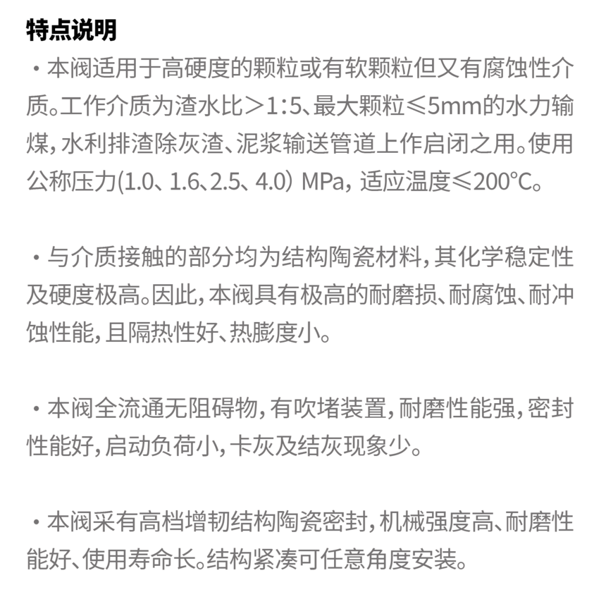 陶瓷排渣阀陶瓷排渣阀适用于高硬度的颗粒或有软颗粒但又有腐蚀性介质。工作介质为渣水比>1:5、最大颗粒≤5mm的水力输煤,水利排渣除灰渣、泥浆输送管道上作启闭之用。使用公称压力(1.0、 1.6、2.5、 4.0) MPa,适应温度≤200°C,与介质接触的部分均为结构陶瓷材料,其化学稳定性及硬度极高。因此,本阀具有极高的耐磨损、耐腐蚀、耐冲蚀性能,且隔热性好、热膨度小。 陶瓷排渣阀全流通无阻碍物,有吹堵装置,耐磨性能强,密封性能好,启动负荷小,卡灰及结灰现象少。 采有高档增韧结构陶瓷密封,机械强度高、耐磨性能好、使用寿命长。结构紧凑可任意角度安装。