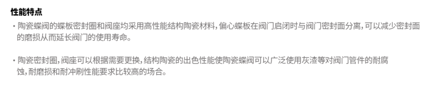陶瓷C阀的蝶板密封圈和阀座均采用高性能结构陶瓷材料,偏心蝶板在阀门启闭时与阀门密封面分离,可以减少密封面的磨损从而延长阀门的使用寿命。陶瓷密封圈,阀座可以根据需要更换,结构陶瓷的出色性能使陶瓷蝶阀可以广泛使用灰渣等对阀门管件的耐腐蚀,耐磨损和耐冲刷性能要求比较高的场合。