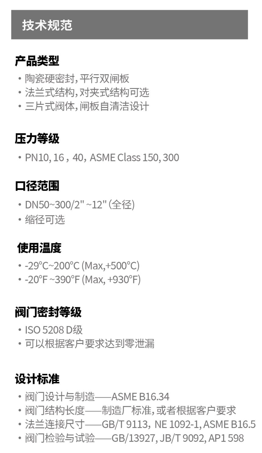 陶瓷双闸阀陶瓷双闸板阀又称陶瓷平行双闸板闸阀或干灰阀,是陶瓷闸阀的一种。故其结构与工作原理与陶瓷闸阀一致,其启闭体(阀板)由阀杆带动阀座密封面作升降运动,可接通或截断流体的通道。陶瓷双闸板阀主要用于干粉物料的进、放料及输送管道上,作截止和接通介质通道用,做仓泵出料阀、平衡阀、排气阀、排堵阀,也可用作管路切换阀和灰库卸灰阀,具有密封性能好、启动负荷小、卡灰及积灰现象少、耐磨性强、使用寿命长的特点。陶瓷双闸板阀通常采用法兰连接方式,可分为手动和电动两种驱动方式。具体来说此系列产品使用范围为:1.电厂除灰—干除灰系统;2.选矿厂—干矿粉状物料的选择、输送;3.水泥行业—干粉料输送、放料;4.面粉厂—面粉输送管道。5.其它粉末或微小固体颗粒等高磨损介质的输送,因这些工矿介质中常有硬质颗粒和纤维性的污垢等物体,该阀在管道系统中作为启闭装置,能起到极好的作用。